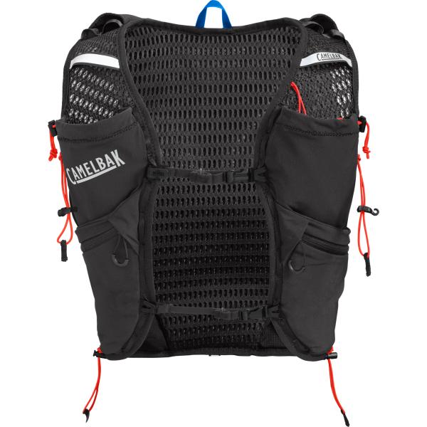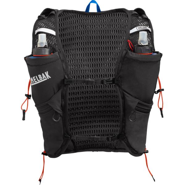 Vesten er designet ultralet, og pasformen er i topklasse, så den holder sig på plads selv i et hurtigt løb. Foran er der to elastiske lommer til Quick Stow 0,5 L-flasker (inkl.), så løberen kan have en flaske til fx sportsdrik og en til vand.