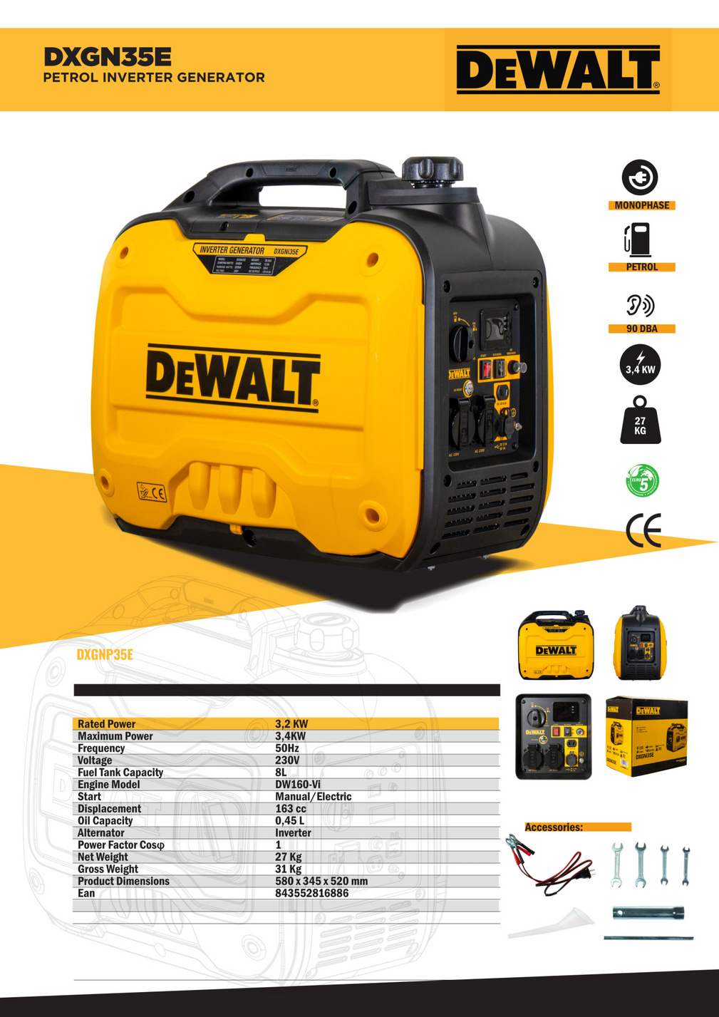 DeWalt invertergenerator DXGNi35E producerer elektricitet af høj kvalitet, med meget god brændstoføkonomi takket være den indbyggede ECO-knap. Den har en maksimal effekt på 3,4 kW og kan køre i op til 7,5 timer kontinuerligt under belastning. Den 8-liters brændstoftank og intelligente forbrugsstyring giver hidtil uset effektivitet i strømproduktionen. Nøje designet ekstra isolering og automatisk hastighedsregulering er anvendt for at minimere motorstøjens gener for øret. Udstyret med elektrisk start.