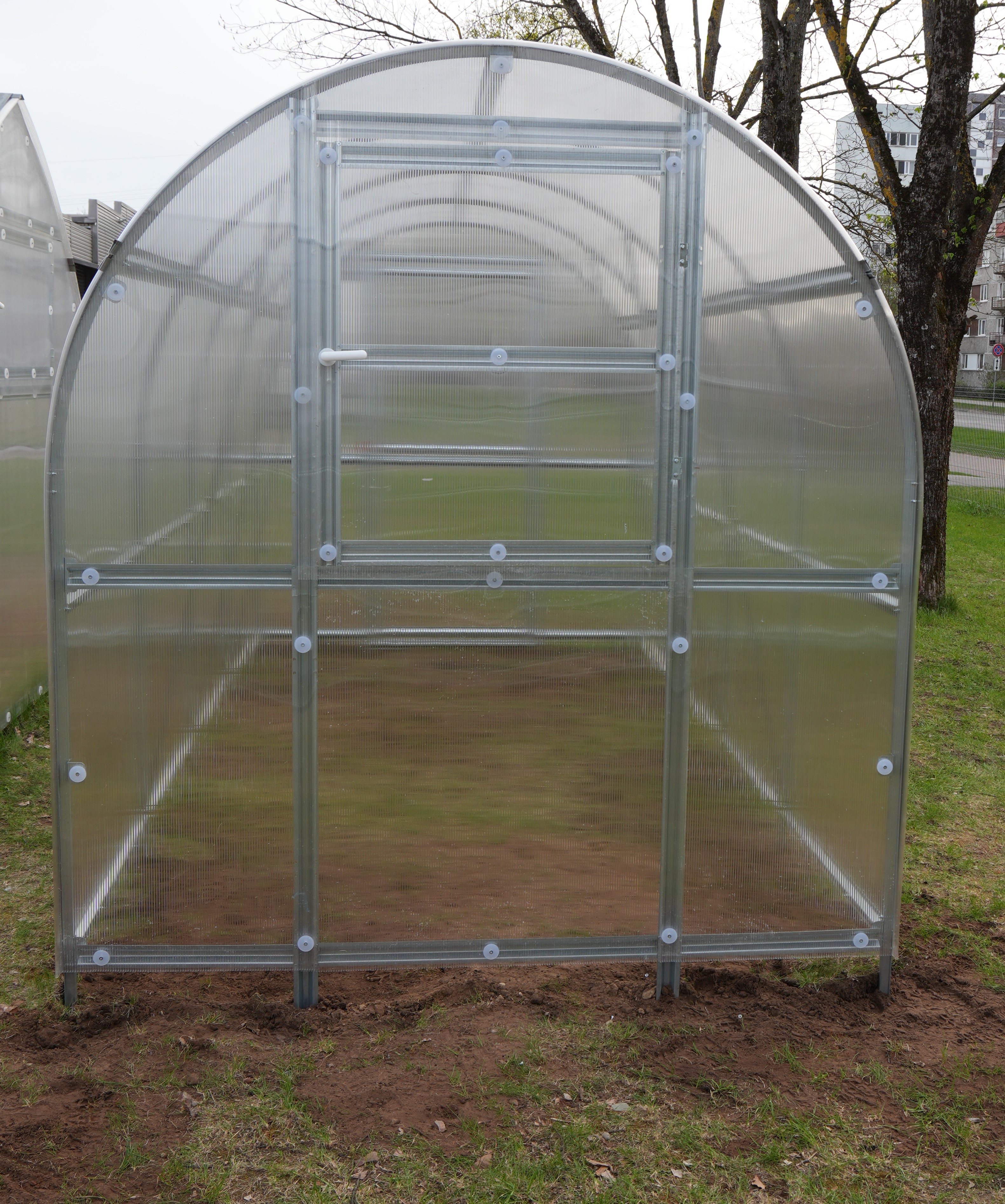 Drivhuset er ikke kun perfekt egnet til de litauiske klimaforhold, monteringsbenene er også nedgravet i jorden langs hele omkredsen til en dybde på 40 cm. Pakken indeholder forstærkninger til hver bue, så drivhuset ikke behøver at blive demonteret om vinteren.