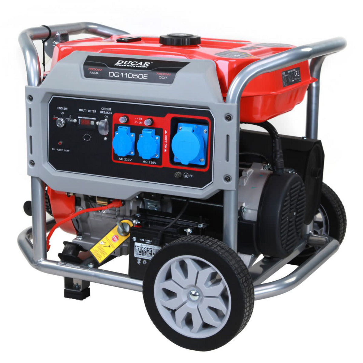 Udstyret med elektrisk start bringer Ducar generator DG11050, en benzindrevet generator med hjul og håndtag, strøm, hvor den er nødvendig.