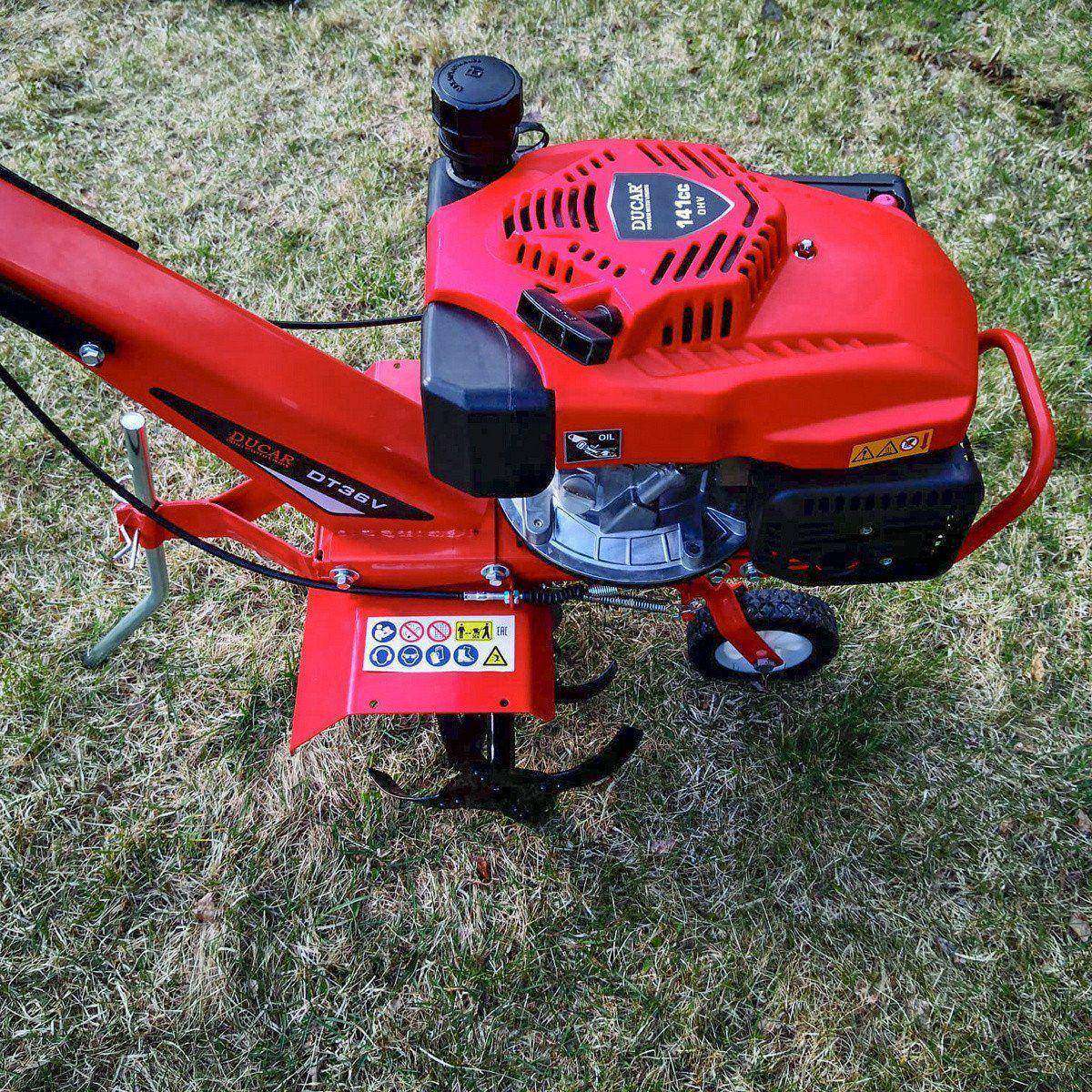 Højkvalitets Ducar kultivator/fræser 161 cc. Støttehjulene på fræseren forhindrer maskinen i at synke ned i jorden og støtter apparatet under brug. Manuel start. Optimal arbejdsstilling og et tilstrækkeligt bredt arbejdsområde.