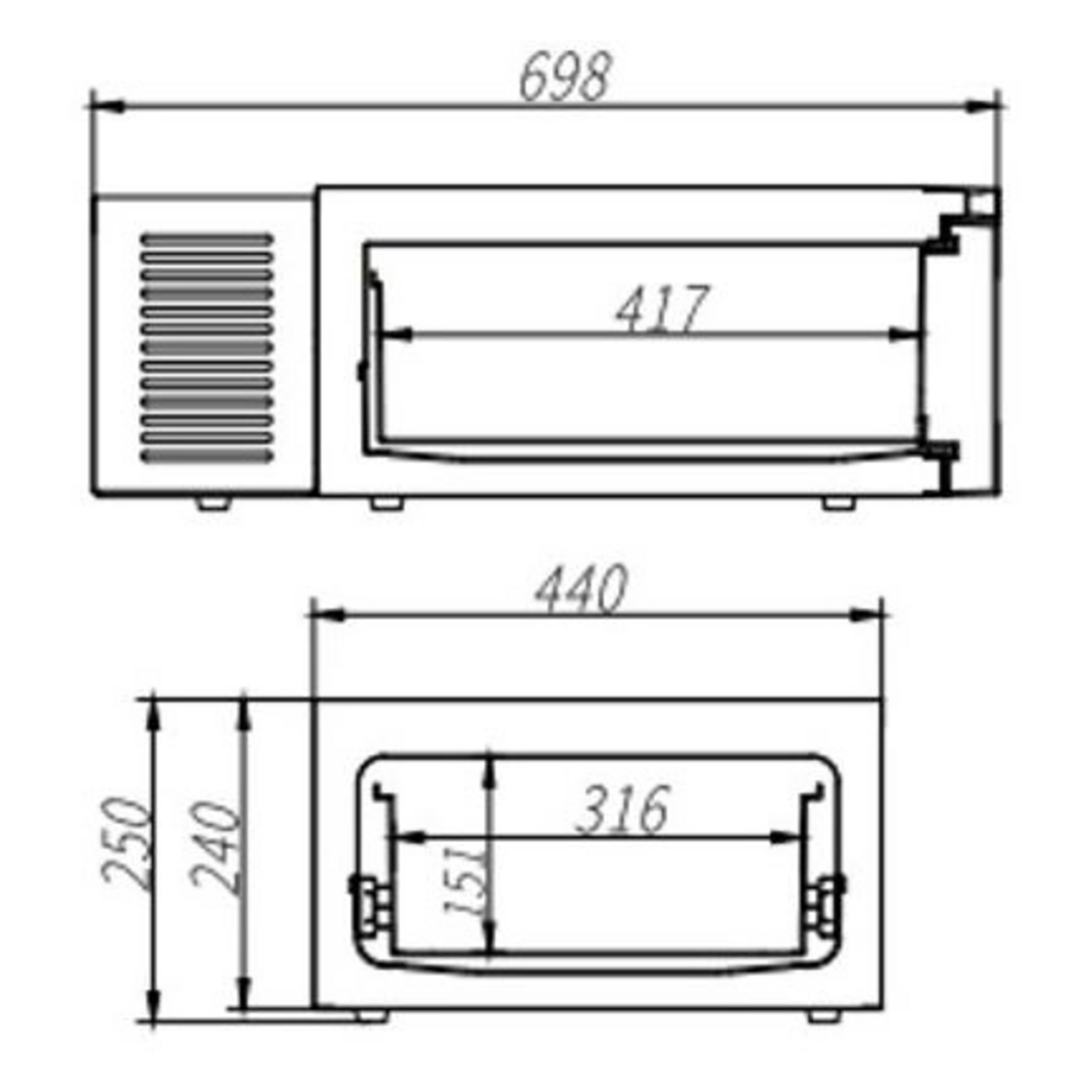 - Dimensioner (B x D x H): 698 x 440 x 250 mm