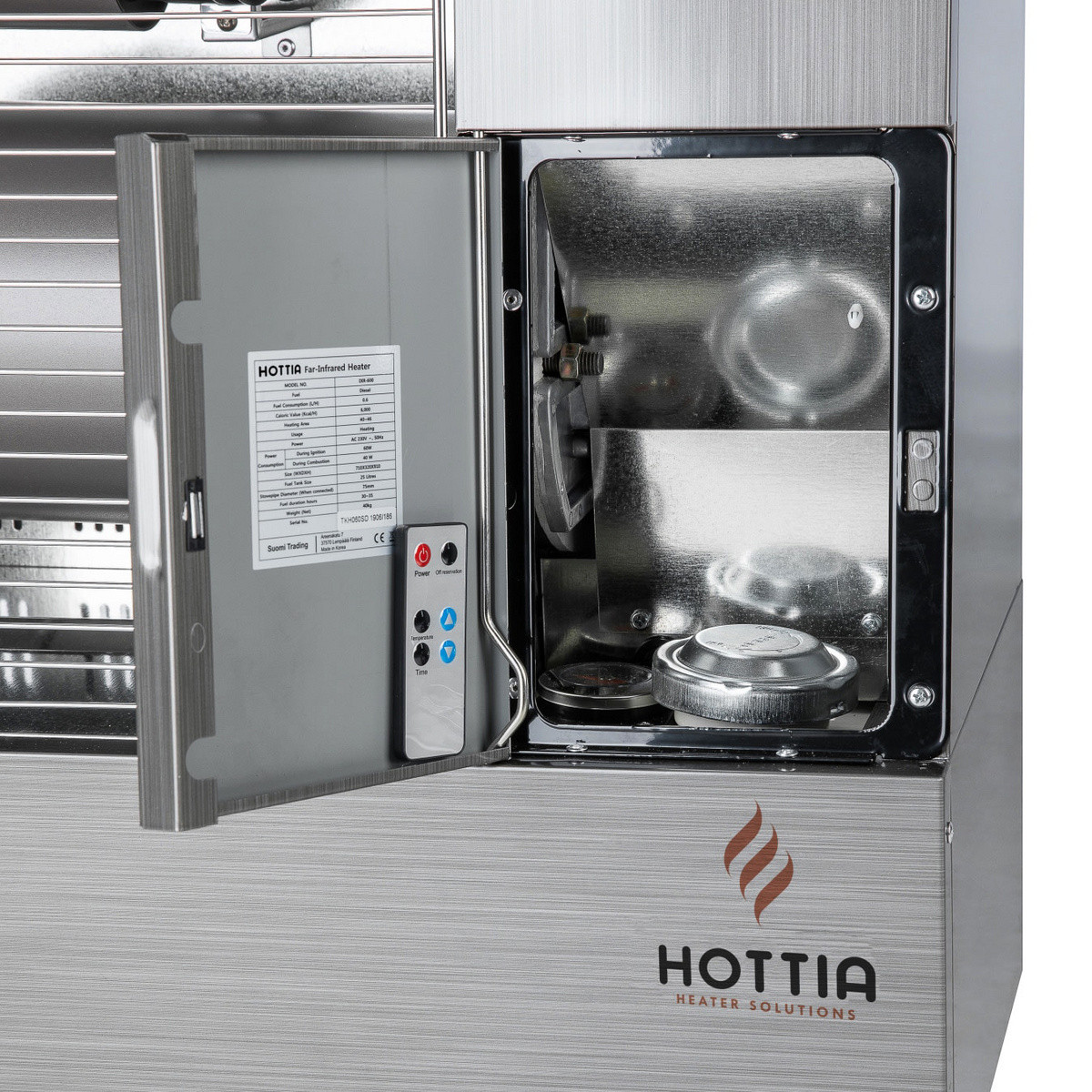 Den infrarøde stråling, som produceres af Hottia oliefyret infrarød varmer DIR-600, opvarmer det faste materiale i opvarmningszonen, som fungerer som et varmeudjævnende og varmelagrende materiale. Fra materialerne i rummet overføres varmen jævnt og behageligt til det omkringliggende rum. Varmen fra Hottia-varmere er aldrig for varm. Den multikomponent- og højeffektive forbrændingsproces samt den præcist styrede brændstoftilførsel sikrer, at der ikke frigives ubehagelige lugte eller kulilte i luften. Hottia-varmere kræver ikke røggasaftræk, forudsat at det rum, der skal opvarmes, er tilstrækkeligt og korrekt ventileret. For at sikre personsikkerheden anbefales det at anvende et røggasaftræk ved opvarmning af beboelsesrum.