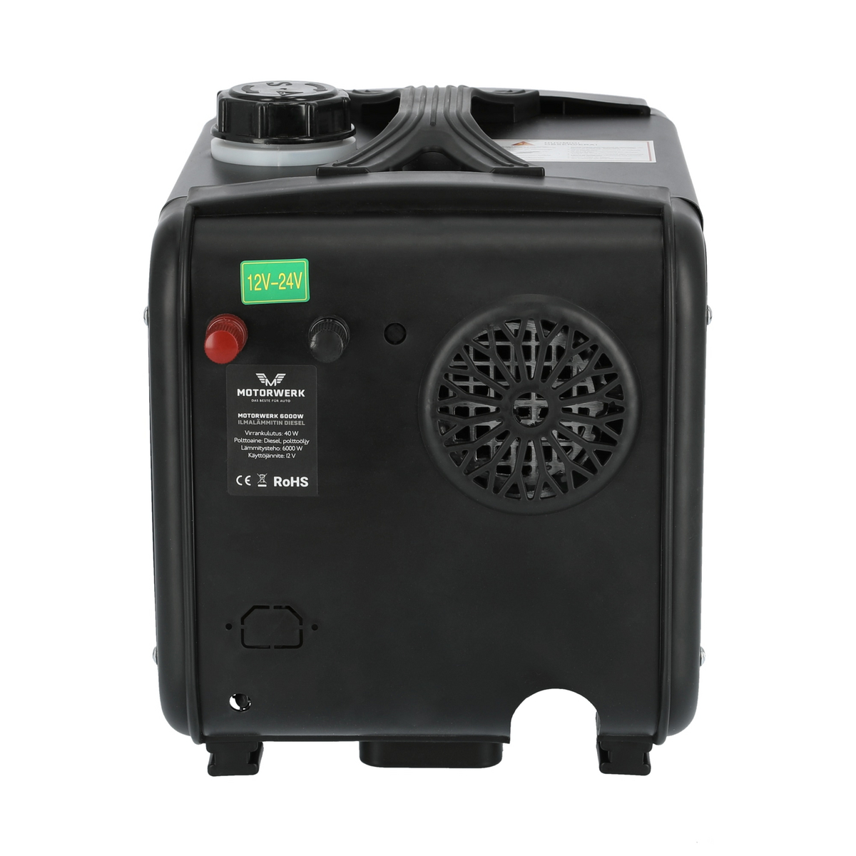 Motorwerk diesel luftvarmer 6 kW er en effektiv og let transportabel afrimnings- og tørrevarmer til midlertidig brug i opbevaringsrum, både, hytter og telte. Varmeren er klar til brug; fyld blot tanken og tilslut ledningerne til 12 V strøm. Varmeren leveres med indtag, røggas- og varmefordelingsrør, et indtagsluftfilter og rørklemmer. Varmeudluftningen kan deles og fordeles gennem fire udgange præcist og jævnt rundt i det rum, der skal opvarmes.