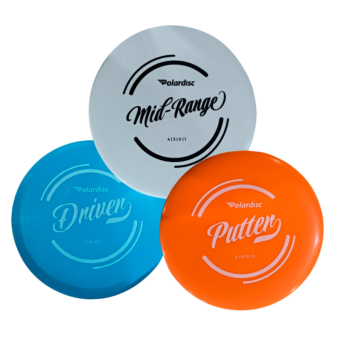 I pakken finder du tre discs: en putter, en approach disc (mid-range) og en driver. Disse er en fantastisk måde at komme i gang og spille din første runde discgolf på!