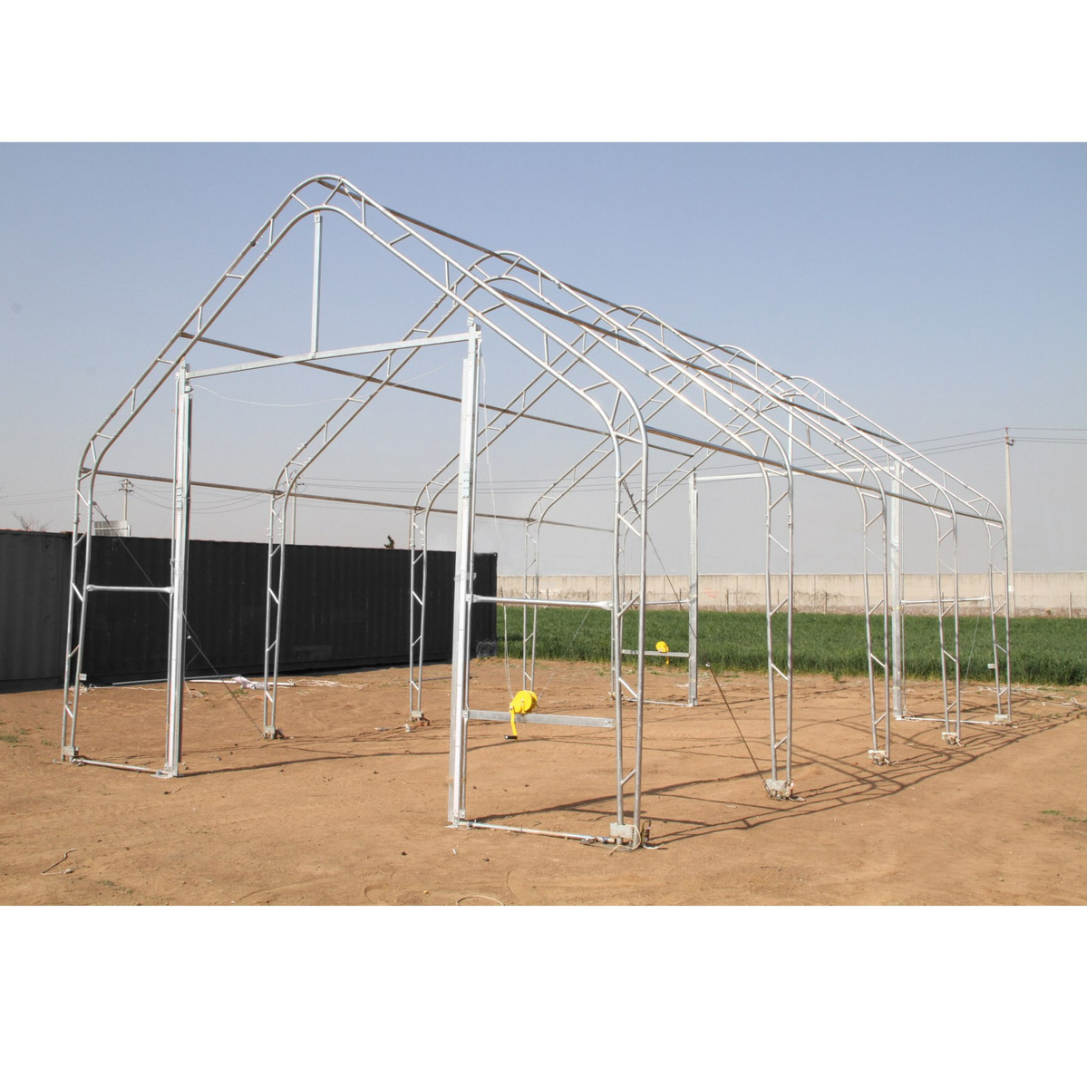 Bemærk! Billedet er kun vejledende, ikke i målestok. Ranch telt Premium 6,1x9,76x4,88 m 900 g. En dobbeltramme udstyrshal udstyret med en kraftig PVC-presenning på 900 g/m².