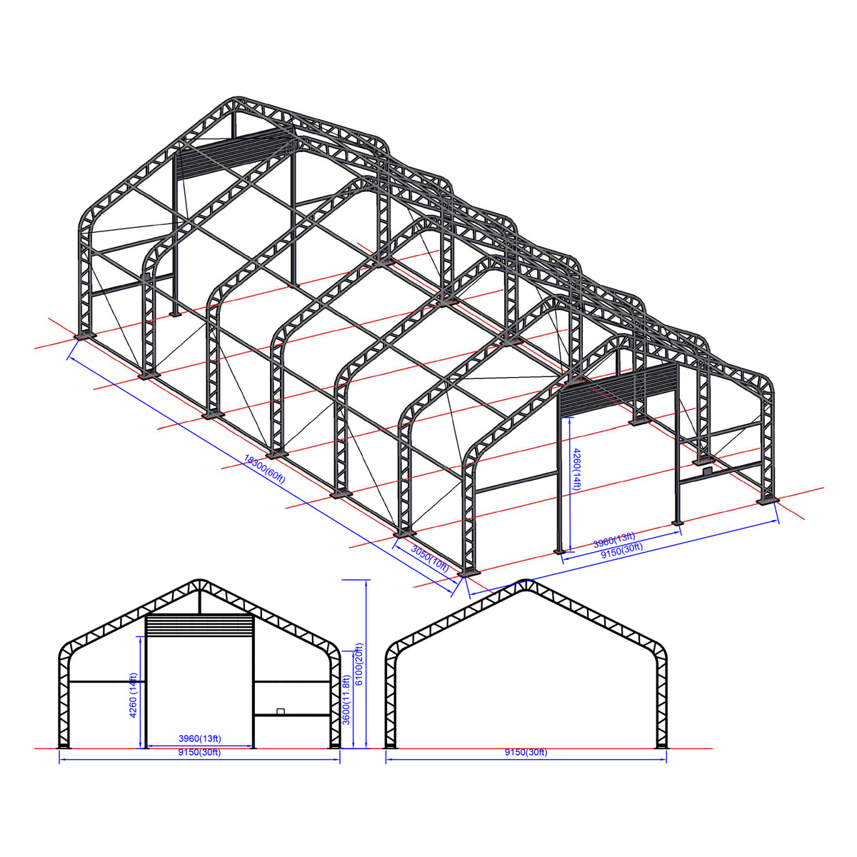 Bemærk! Billedet er vejledende, ikke i målestok. En dobbeltramme redskabshal udstyret med en kraftig PVC-dug på 900 g/m².
