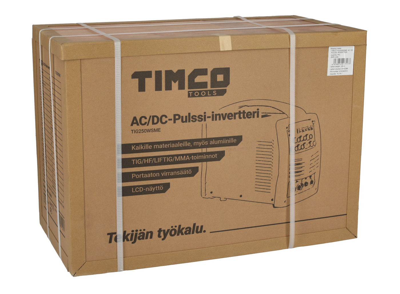 Timco AC/DC Pulse inverter TIG250WSME er en ny AC/DC-pulsinverter, der er en let, bærbar og virkelig kompakt TIG-svejsemaskine. Den er egnet til lettere industriproduktion, vedligeholdelse og reparation, landbrug og bilindustrien. TIG250WSME er designet til TIG-svejsning af høj kvalitet. Med denne TIG-svejsemaskine kan du svejse næsten alle slags metaller, f.eks. stål, rustfrit stål, krom, titanium og aluminium! Når forholdene ikke egner sig til TIG-svejsning, kan du altid skifte til stiksvejsekabler og udføre arbejdet med stiksvejsning.