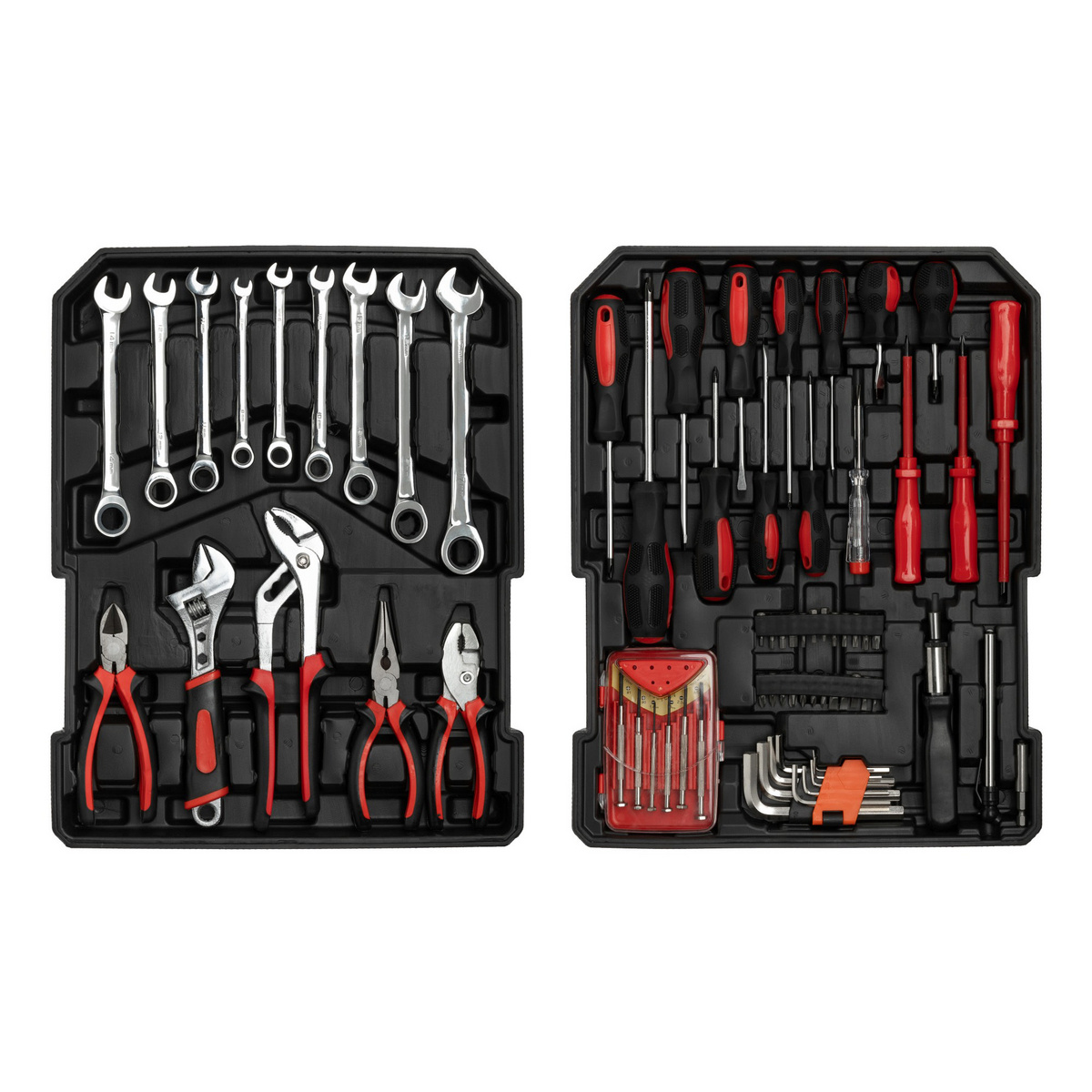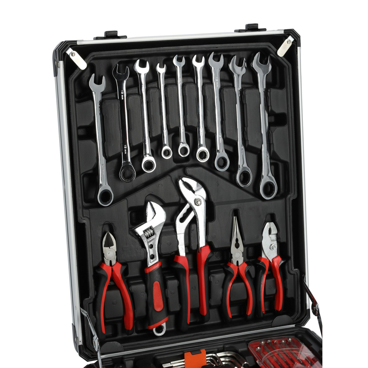 Opbevaringskassen er lavet af aluminium og har et teleskophåndtag til de gange, hvor du har brug for at tage værktøjerne med ud til brugsstedet. Værktøjerne er pakket meget tæt for nem opbevaring. Hvert værktøj har sin egen markerede plads i kassen. Indeholder topnøglesæt, ringskruenøglesæt, tænger, skruetrækkersæt, unbrakosæt, bit-sæt, skruetrækkerpas, beslag, målebånd og andre enkeltstående værktøjer. Værktøjerne er varmebehandlede for at forbedre styrke og levetid betydeligt. Varmebehandlingen har en hårdhed på 45. Ringskruenøgler og toppe i 45-graders varmebehandlet lavkulstofstål, skralder og bit-sæt i krom-vanadium.