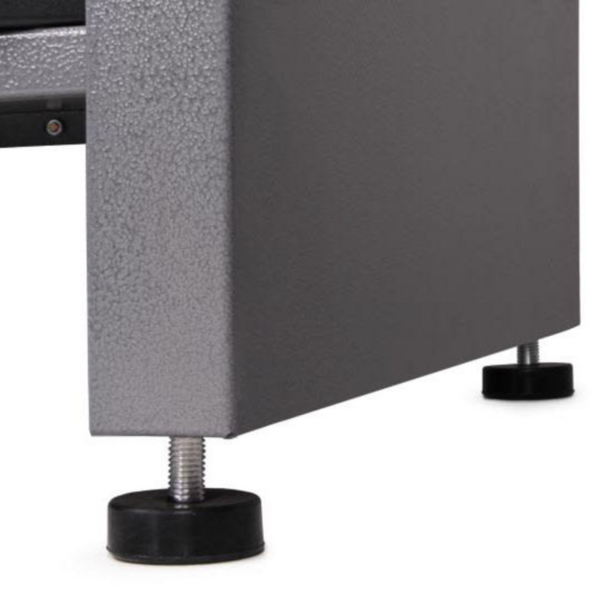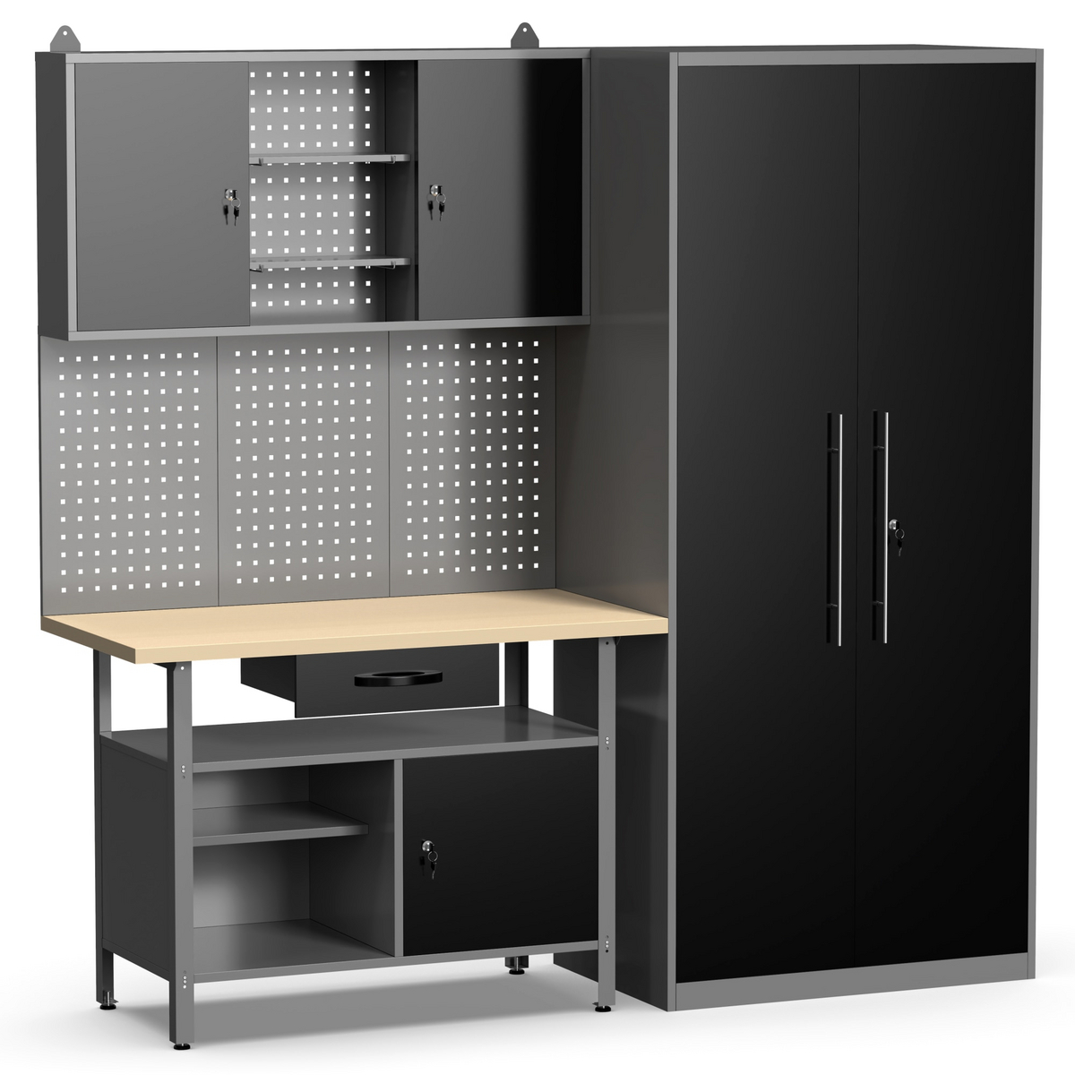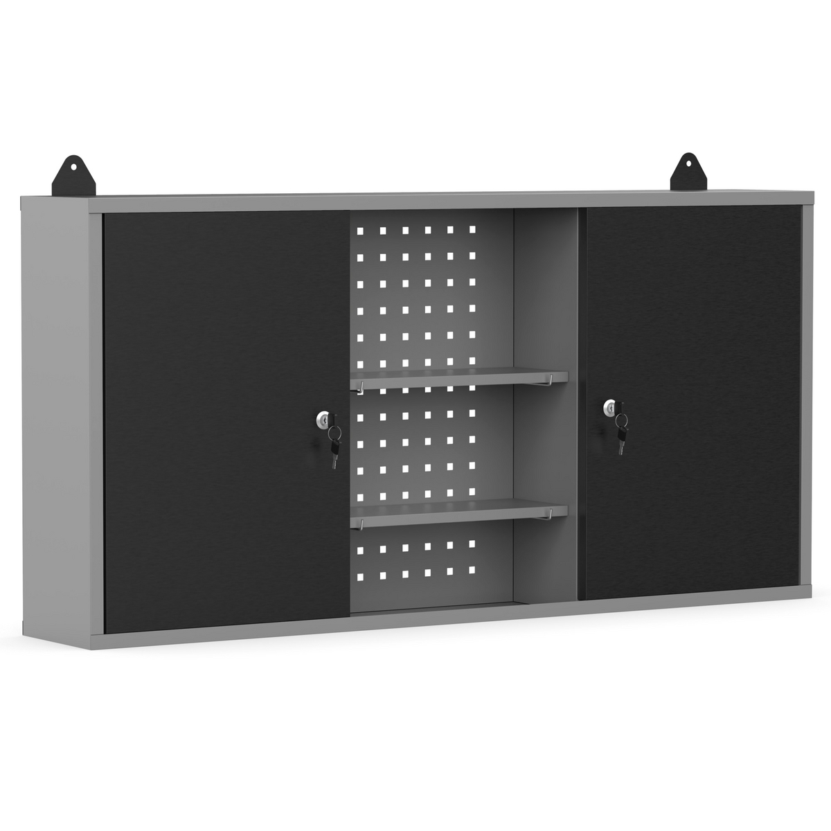 Det mellemliggende rum er udfyldt med perforerede panelvægge, hvor kroge, stativer, måleværktøj mv. til værktøj og tilbehør kan monteres efter ønske. Det høje skab og de tre mindre skabe kan alle låses. To nøgler medfølger.