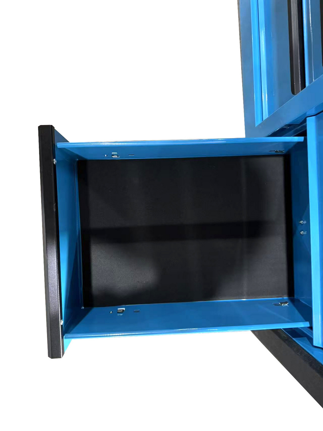 Et træ, fladt arbejdsbord giver en uforstyrret og tilstrækkelig bred arbejdsflade. Den flade platform er også egnet til opbevaring. Værktøjsvognen har tolv let glidende skuffer. Siden af vognen har en hulplade til ophængskroge.