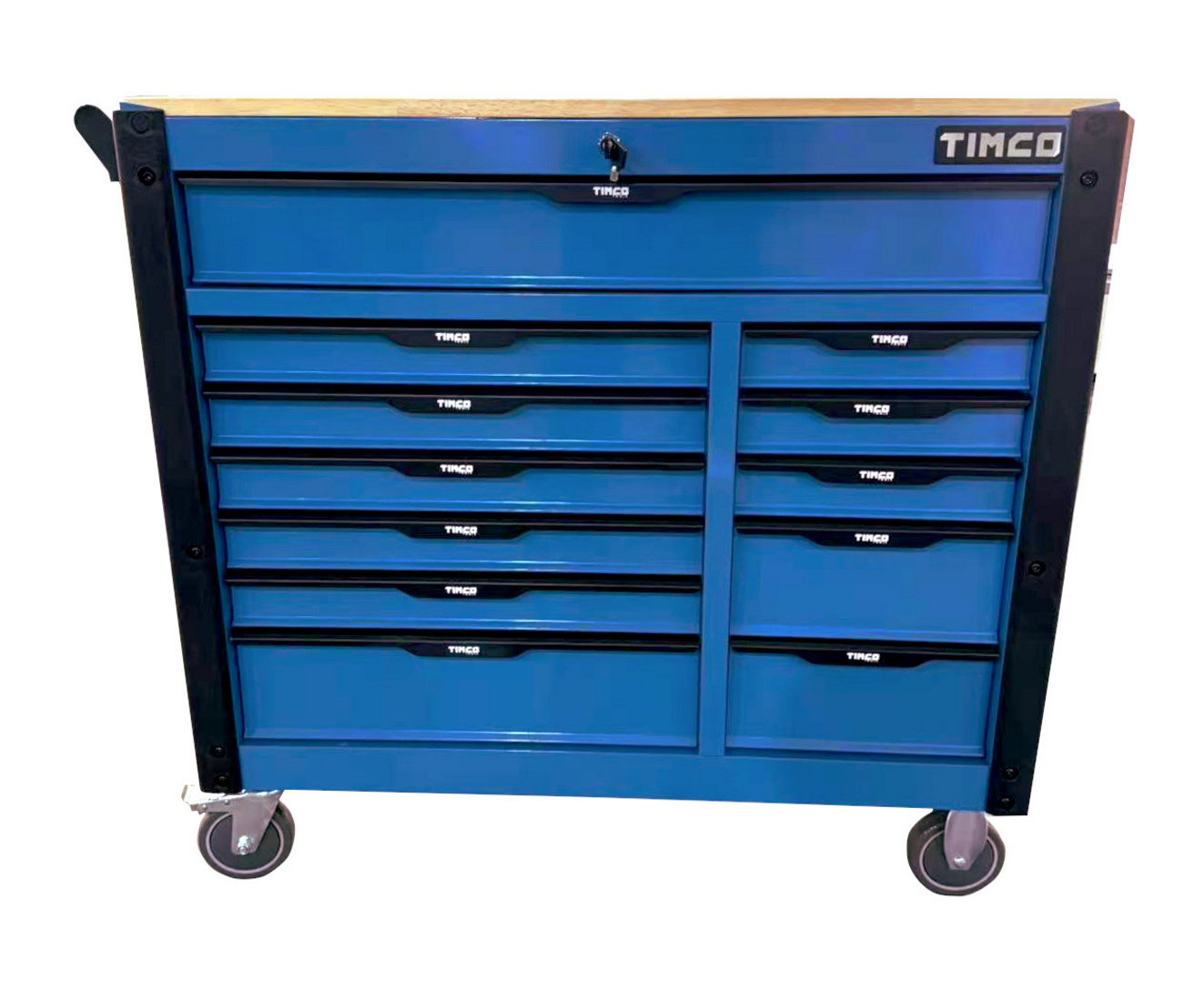 Timco 12ltk værktøjsvogn er fremstillet af holdbare, højkvalitets materialer, herunder en stålramme, kraftige hjul, robuste skuffer og en massiv træbordplade.